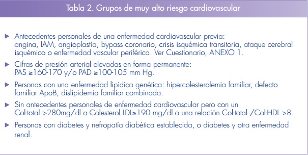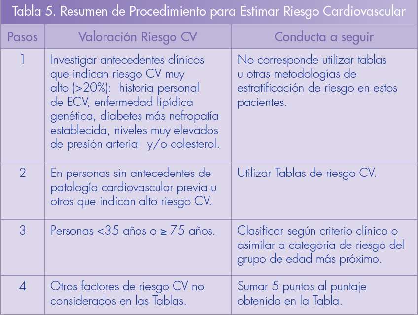 Las personas menores de 35 años, sólo por ser jóvenes, tienen una probabilidad baja de tener un evento cardiovascular en los próximos 10 años; sin embargo, estarán expuestas durante muchos años a los factores de riesgo. Puede ser un ejercicio muy ilustrativo utilizar la Tabla, y mostrarle a la persona como irá aumentando su riesgo con los años si mantiene su actual perfil de riesgo. En los jóvenes se deben hacer los máximos esfuerzos por controlar los factores de riesgo a través de cambios en el estilo de vida.